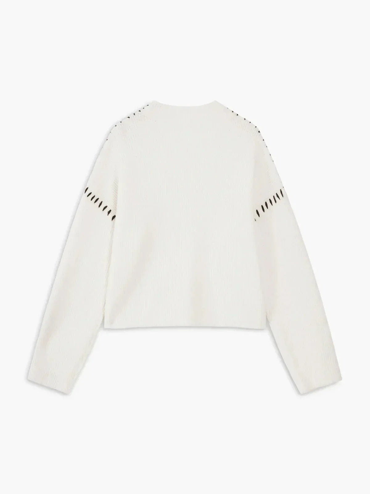 Svetr Zora spojuje moderní, nadrozměrný střih s propracovanými detaily na rukávech a ramenou, které přidávají řemeslný nádech. Vyrobený z měkké, hřejivé vlny, tento svetr má žebrovanou strukturu a klasický stojáček, jenž vyzařuje teplo i eleganci.