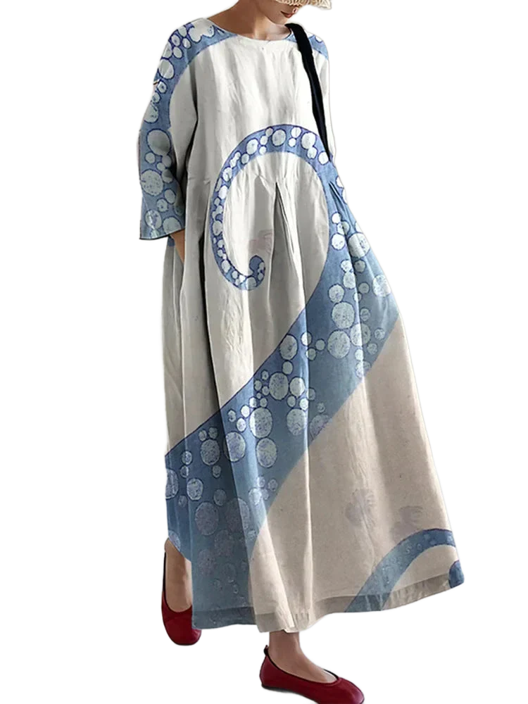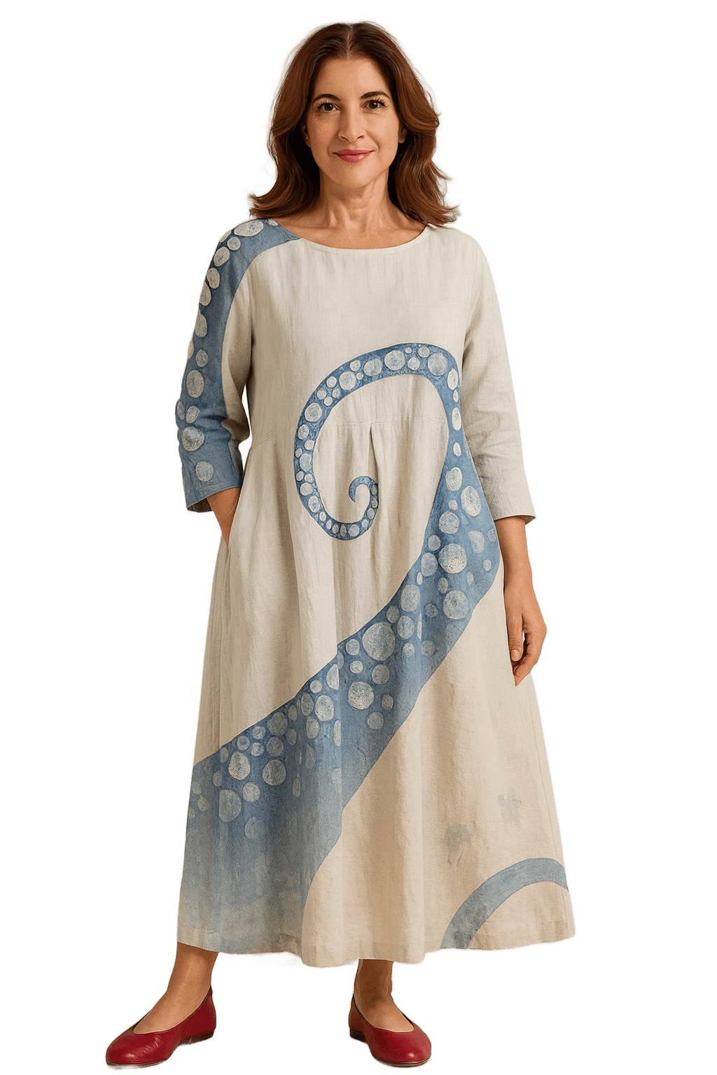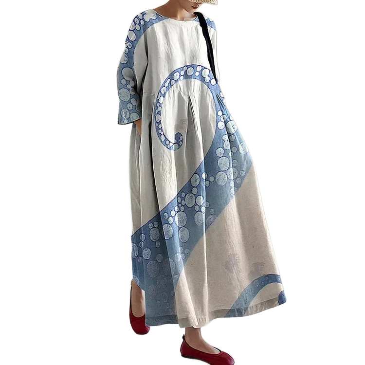 Nejpohodlnější a nejstylovější šaty ve tvém šatníku jsou tady! Ludmila jsou maxi šaty s unikátním potiskem chobotnice, který ti dodá zářivý a nezapomenutelný vzhled. Jsou vyrobeny ze směsi lnu a bavlny pro maximální pohodlí, takže jsou ideální na horké letní dny, procházky po pláži nebo jen pro příjemný pocit během obyčejného dne. Pohodlné, vzdušné a stylové – přesně to, o čem jsi vždy snila!